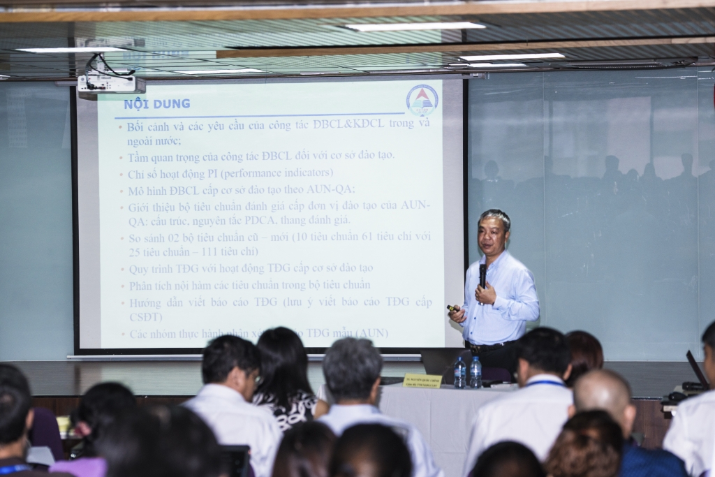 Tại lớp tập huấn, TS Nguyễn Quốc Chính đã cung cấp cho người học những nội dung như: mô hình ĐBCL cấp cơ sở đào tạo theo AUN-QA; Bộ tiêu chuẩn tự đánh giá cấp cơ sở đào tạo của AUN-QA; Các tiêu chuẩn trong nhóm Hệ thống (Systemic QA); Các tiêu chuẩn trong nhóm Hoạt động đào tạo; Các tiêu chuẩn trong nhóm NCKH+ Phục vụ cộng đồng.