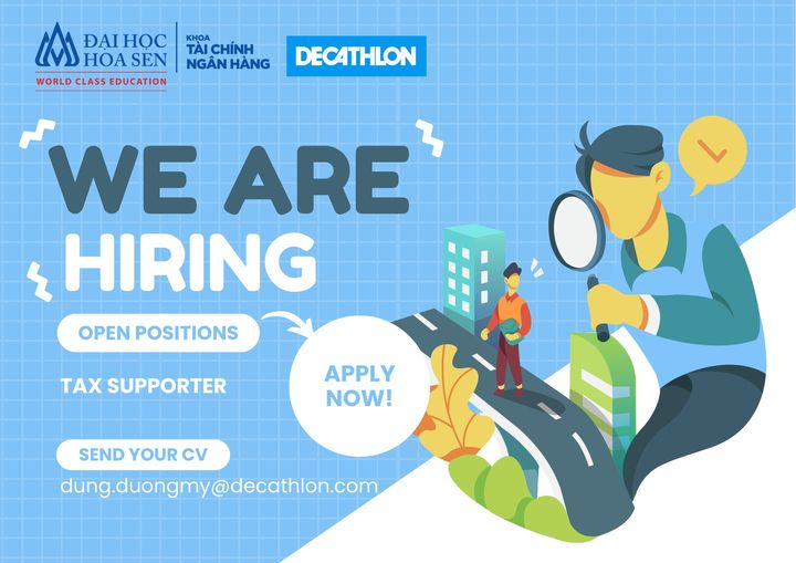 DECATHLON COMPANY is a French company specializing in the production of top sports products in Europe. Currently, our company is looking for a 2nd-3rd year student majoring in Accounting – Auditing for the position of Tax supporter: CANDIDATE REQUIREMENTS: BENEFITS: Application deadline: 15/03/2024 Start date: April 2024 How to apply: For more information, please contact: If you are interested in this job, please do not hesitate to send your CV to Ms. Dung: Email: dung.duongmy@decathlon.com Our company looks forward to cooperating with dynamic, creative, and responsible candidates. —————————————– Faculty of finance and banking Website: https://www.hoasen.edu.vn/tcnh/ Email: khoatcnh@hoasen.edu.vn #KhoaTaichinhNganhang #DaiHocHoaSen #HSU...