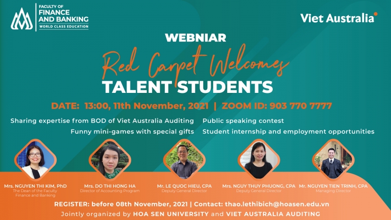 Webinar “Red Carpet Welcomes Talent Students” – “Thảm đỏ đón Sinh viên tài năng” được phối hợp tổ chức giữa Khoa Tài Chính – Ngân Hàng và Công ty Kiểm Toán Việt Úc.