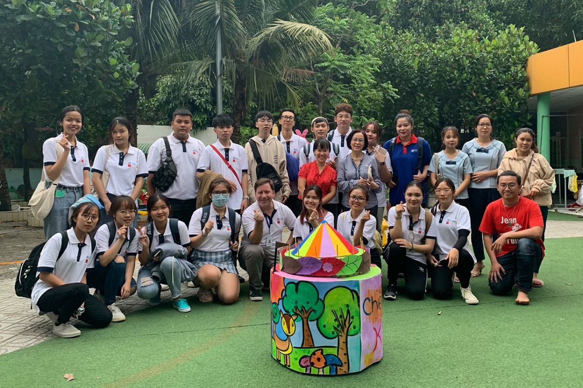 Nhóm sinh viên Chương trình Hoa Sen Plus chụp ảnh kỷ niệm tại trường mầm non Thảo Hiền