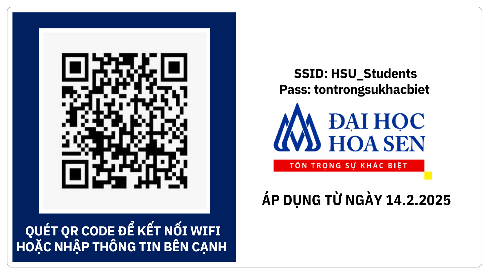 - Trường sẽ thực hiện dán mã QR của Wifi tại tất cả các phòng học. Sinh viên có thể quét mã QR này để kết nối trực tiếp vào mạng Wifi HSU_Students mà không cần nhập mật khẩu.