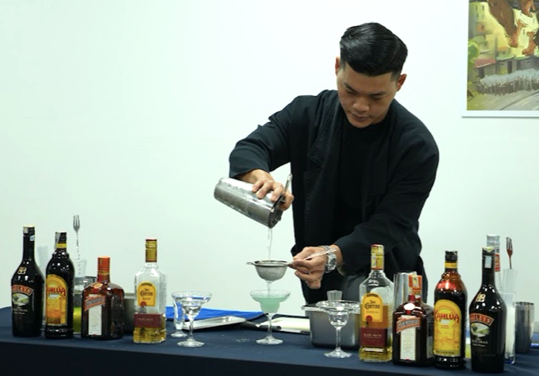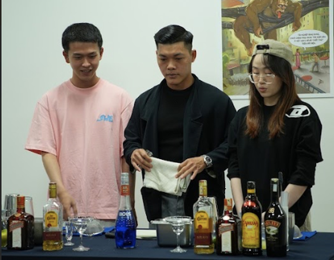 Trong hai giờ, anh Quang đã hướng dẫn sinh viên pha chế thức uống Margarita và B52 và kể những câu chuyện thú vị đằng sau những thức uống này.