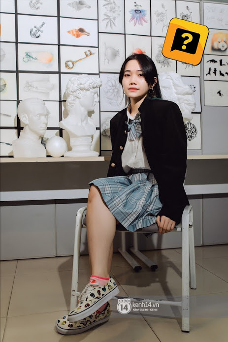 Dù diện set đồ nữ sinh Nhật Bản, để tóc hime nhưng cô bạn Trần Ngọc Phương Lan tâm sự mình không thực sự là fan cuồng của thời trang xứ Phù Tang mà chỉ đơn thuần muốn F5 phong cách cho mới mẻ thôi. Thay vì chọn một đôi sneaker trắng an toàn, cô bạn chọn một đôi sneaker họa tiết ngộ nghĩnh cùng đôi tất hồng khá đáng yêu, tạo nên một điểm nhấn hay ho cho tổng thể