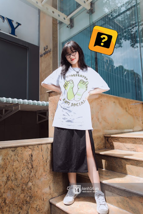 Thuận – cô bạn 21 tuổi chọn một outfit trẻ trung với áo phông trắng in họa tiết cùng dòng chữ tuyên ngôn khá cá tính, phối cùng chân váy đen xẻ đùi. Cô bạn không quên sử dụng phụ kiện như dây chuyền ánh kim cùng vòng tay màu sắc làm điểm nhấn