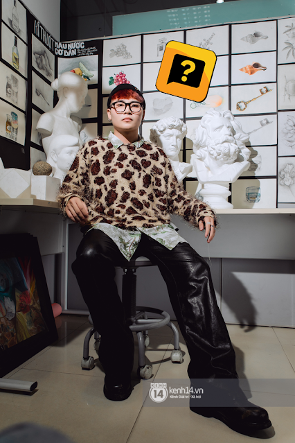 Đây có lẽ là người “màu sắc” và diện nhất buổi phỏng vấn. Đối lập với phong thái trả lời nhẹ nhàng, hơi bẽn lẽn trong video, Chí Cường lại cho thấy mình rất có gout ăn mặc và phối đồ. Cậu bạn mix áo sơ mi mang vibe nhiệt đới với áo len da beo lông xù theo style áo trong áo ngoài, quần da ống hơi loe, platform boot và mũ beanie đen để cân bằng lại hai item nổi bật kia
