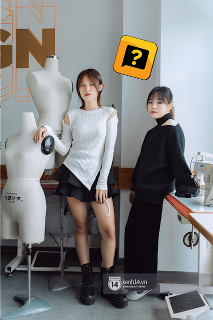 Anh Đào (trái) và Thiên Thanh (phải) lại đem tới hai phong cách hoàn toàn trái ngược nhau. Trong khi Anh Đào cá tính với chiếc áo trắng thiết kế bất đối xứng, cut-out ở vai, mix cùng mini skirt xếp tầng và chunky boot thì Thiên Thanh, dù cũng chọn thiết kế cut-out ở vai, nhưng lại mang đến hình ảnh kín đáo và khá hiền trong set đồ full black của mình
