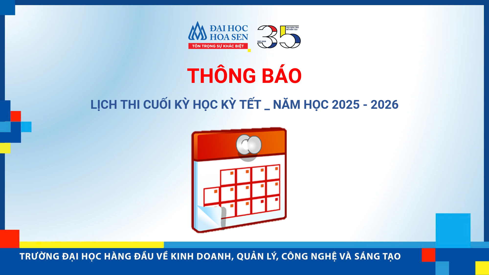 Phòng Đào tạo đại học thông báo đến các bạn Sinh viên về Lịch thi Cuối kỳ Học kỳ Tết _ Năm học 2025-2026 (Mã HK 25.1B) được tổ chức thi tại cơ sở Thành Thái như sau: 1. Lịch thi Cuối kỳ Học kỳ Tết_Năm học 2025-2026 (HK 25.1B): TẠI ĐÂY 2. Thông báo về việc thực hiện Quy chế tổ chức thi và quản lý điểm: TẠI ĐÂY 3. Quy định thi: TẠI ĐÂY 4. Hướng dẫn Sinh viên đăng ký thi theo Quyết định Hoãn thi, Miễn học phải thi, Thi đặc cách: TẠI ĐÂY Sinh viên phải xem kỹ Lịch thi để tham dự thi đúng ngày, giờ và phòng thi. Trong trường hợp Sinh viên có thắc mắc, vui lòng liên hệ chị Phạm Nguyễn Thanh Thảo qua email: thao.phamnguyenthanh@hoasen.edu.vn trước 17g00 ngày 04/03/2026.