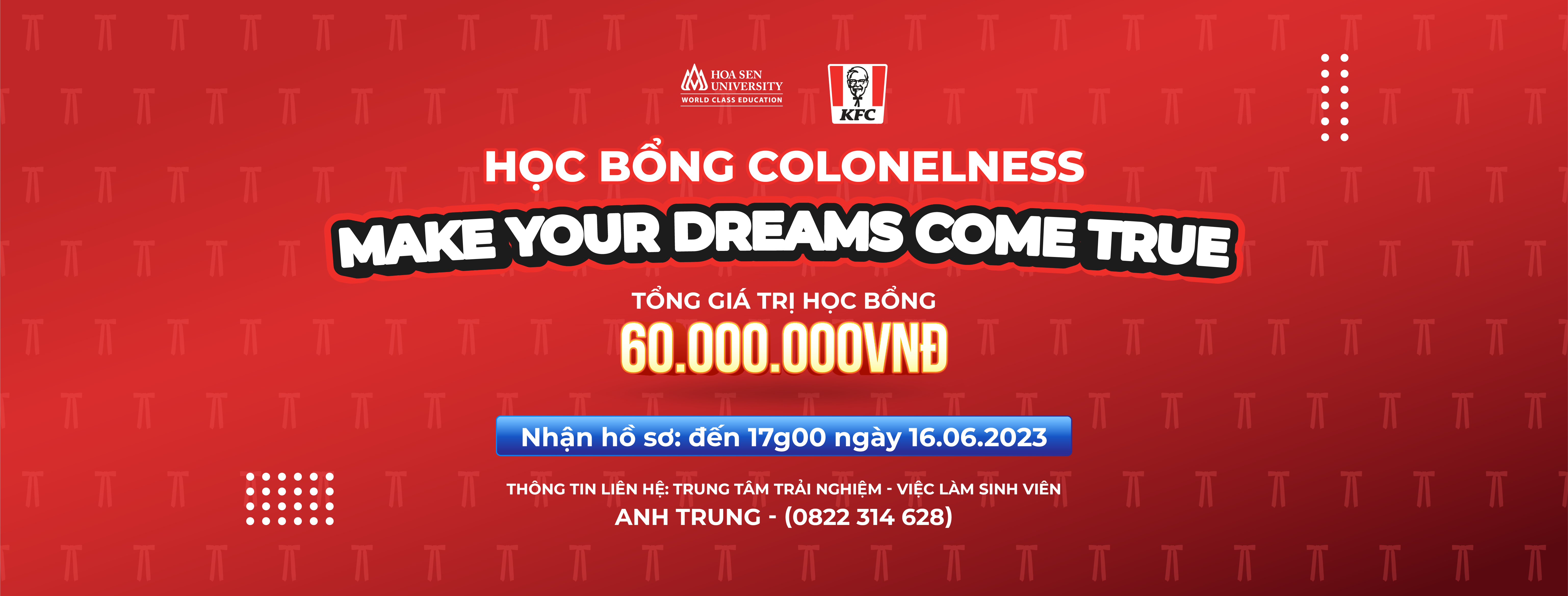 Học bổng Colonelness là chương trình được đầu tư, là nơi để các sinh viên có nhiệt huyết, đam mê của bản thân với lĩnh vực khởi nghiệp hay xây dựng dự án cho cộng đồng, là môi trường thích hợp để trau dồi kiến thức, kỹ năng ngành nghề trong tương lai. Học bổng do Công ty Liên doanh TNHH KFC Việt Nam tài trợ cho sinh viên đang theo học tại Trường Đại học Hoa Sen.