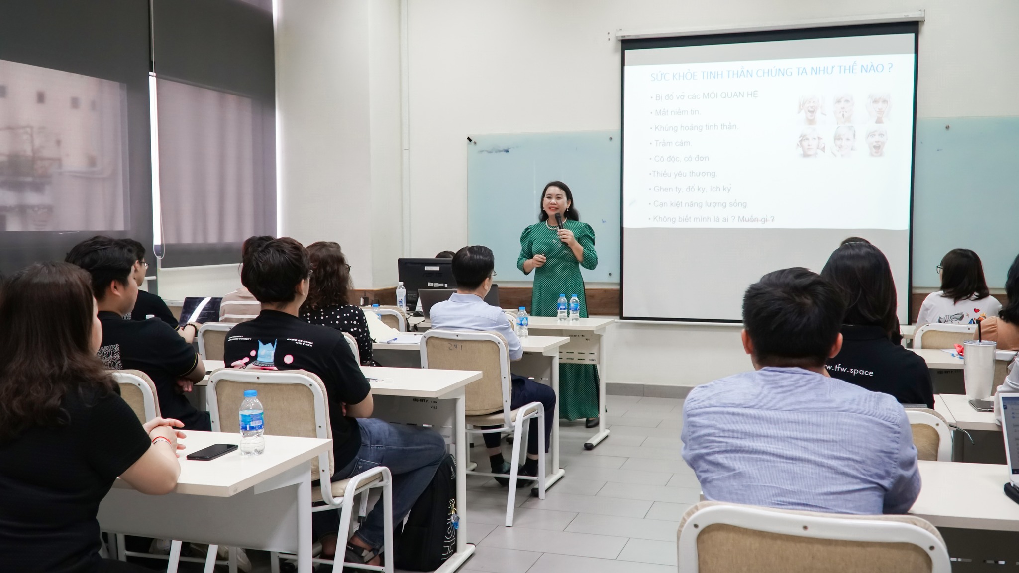 Trong phần chia sẻ của Thạc sĩ Nguyễn Thị Tâm, cô đã chỉ ra được một sự thật về sự mất kết nối giữa các mối quan hệ trong cuộc sống của chúng ta phần nhiều là do sự mất kết nối với chính bản thân mình, chúng ta đôi khi “ôm đồm” quá nhiều thứ trong cuộc sống mà quên đi việc cảm nhận sự “hân hưởng” và biết ơn những điều nhỏ nhặt trong cuộc sống. Từ đây, cô đã cho các bạn sinh viên thực hành ngay tại chỗ sự “tỉnh thức – mindfulness” để các bạn có thể chậm lại một chút và cảm nhận, chữa lành đứa bé bên trong dễ dàng hơn.