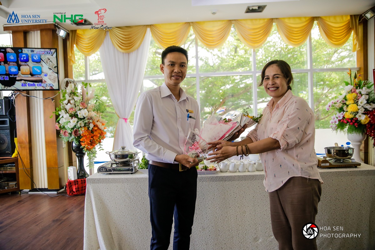 Cô Đỗ Thị Kim Quyên – Trưởng BTC, Giảng viên Trường ĐH Hoa Sen, thành viên Trung tâm Bảo tồn và Phát triển ẩm thực Việt tặng hoa và kỷ niệm chương cảm ơn anh Trung Dân – Đại diện Nhà Hàng Gành Hào 2.