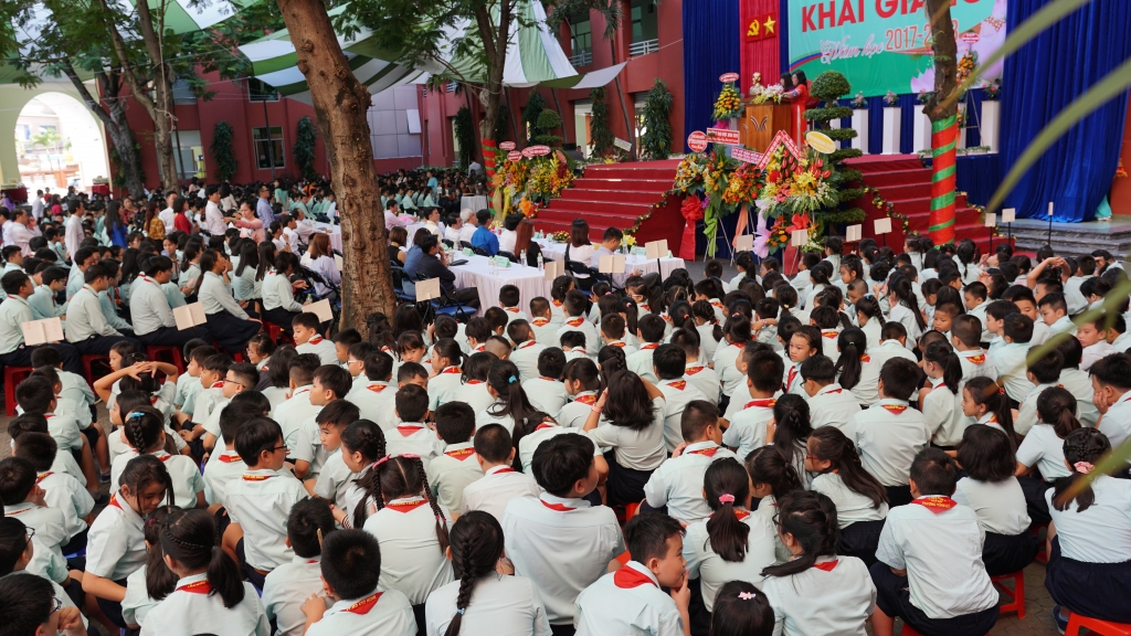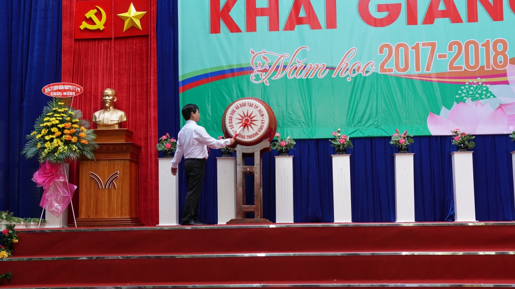 Sau phần đọc thư của Chủ tịch Nước Trần Đại Quang gửi toàn thể giáo viên và học sinh nhân ngày khai trường là diễn văn khai giảng và đánh trống khai trường của thầy Hiệu trưởng Phan Văn Thanh. Tiếng trống mừng năm học mới vang lên giữa sân trường tháng 9 mùa thu xanh thẳm cũng là tiếng trống đón chào các em học sinh khối lớp 1, lớp 6 và lớp 10 trong những ngày đầu cấp học.
