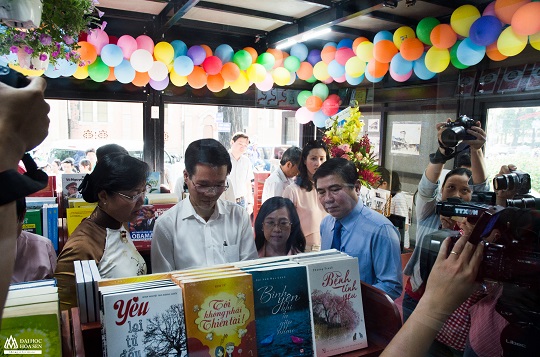 Sau khi hoàn tất lễ cắt băng khánh thành, lãnh đạo thành phố Hồ Chí Minh tham quan các gian hàng tại Đường sách.
