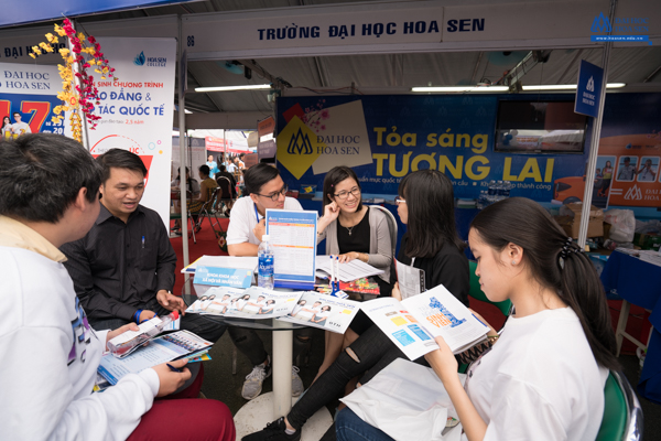 Đến với gian tư vấn của Đại học Hoa Sen, các bạn học sinh đã được trao đổi cùng các chuyên gia về xu hướng nghề nghiệp và lựa chọn hướng đi phù hợp; gặp gỡ các thầy Trưởng khoa, Chủ nhiệm chương trình cùng các giảng viên, chuyên gia để tìm hiểu về ngành nghề đào tạo của Nhà trường; tìm hiểu về phương thức xét tuyển, hướng dẫn cách thức dự tuyển học bổng vào trường Đại học Hoa Sen. Song song đó, tại gian hàng cũng có nhiều hoạt động sôi nổi của các bạn sinh viên Hoa Sen chẳng hạn như làm kẹo bông, thưởng thức bánh ngọt do sinh viên chương trình hợp tác quốc Vatel thực hiện, chụp ảnh với mô hình những nhà tâm lý nổi tiếng, và nhận nhiều vật phẩm lưu niệm cùng tài liệu ấn phẩm tuyển sinh hữu ích.