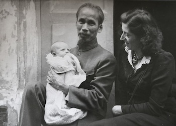 | Chủ tịch Hồ Chí Minh ẵm cô bé Babette, ngồi bên bà Lucie Aubrac (1946). |