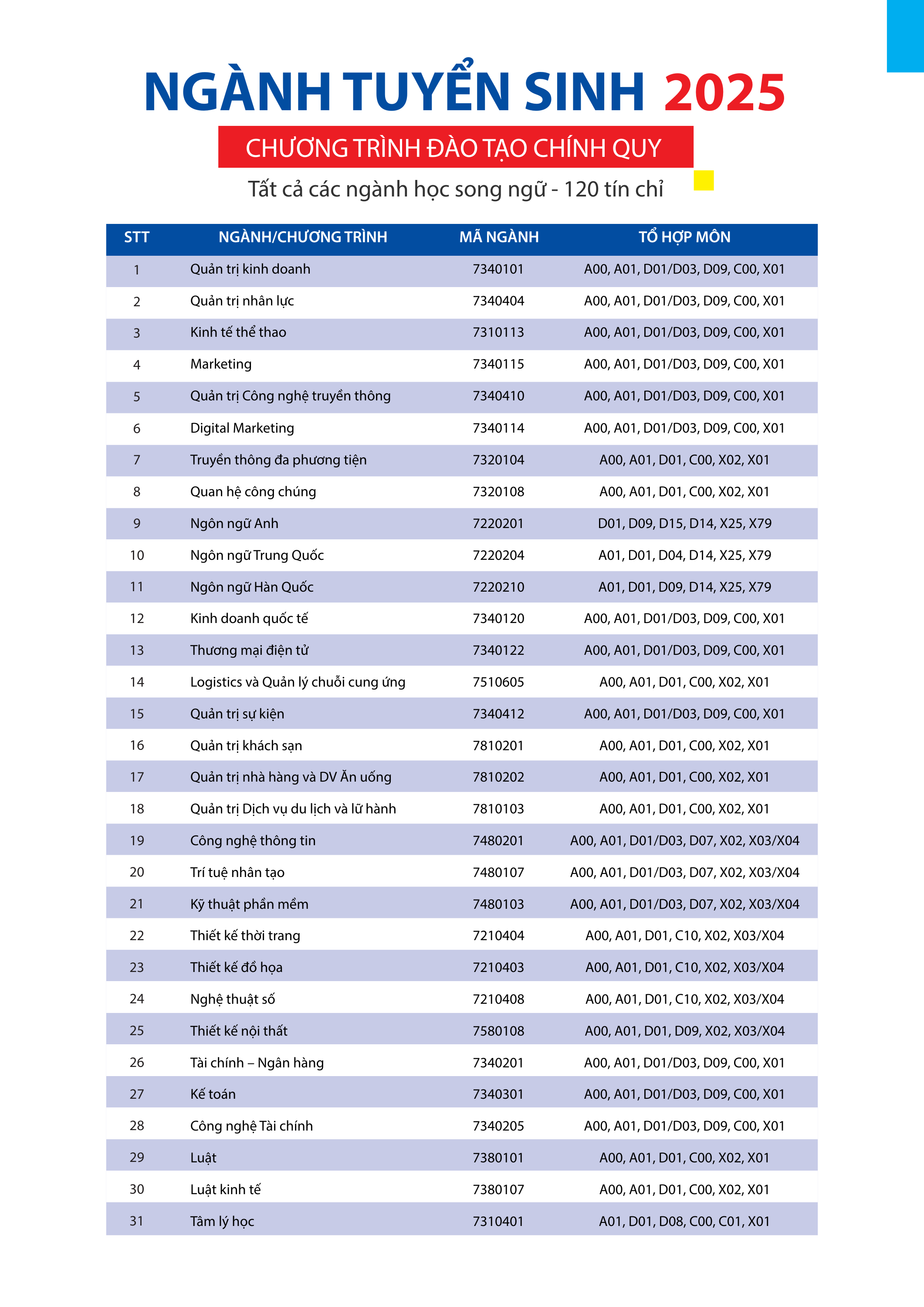 Dưới đây là danh sách tổ hợp môn xét tuyển áp dụng cho 31 ngành đào tạo của Trường Đại học Hoa Sen năm 2025. Thí sinh có thể lựa chọn tổ hợp phù hợp với thế mạnh cá nhân để tăng cơ hội trúng tuyển.