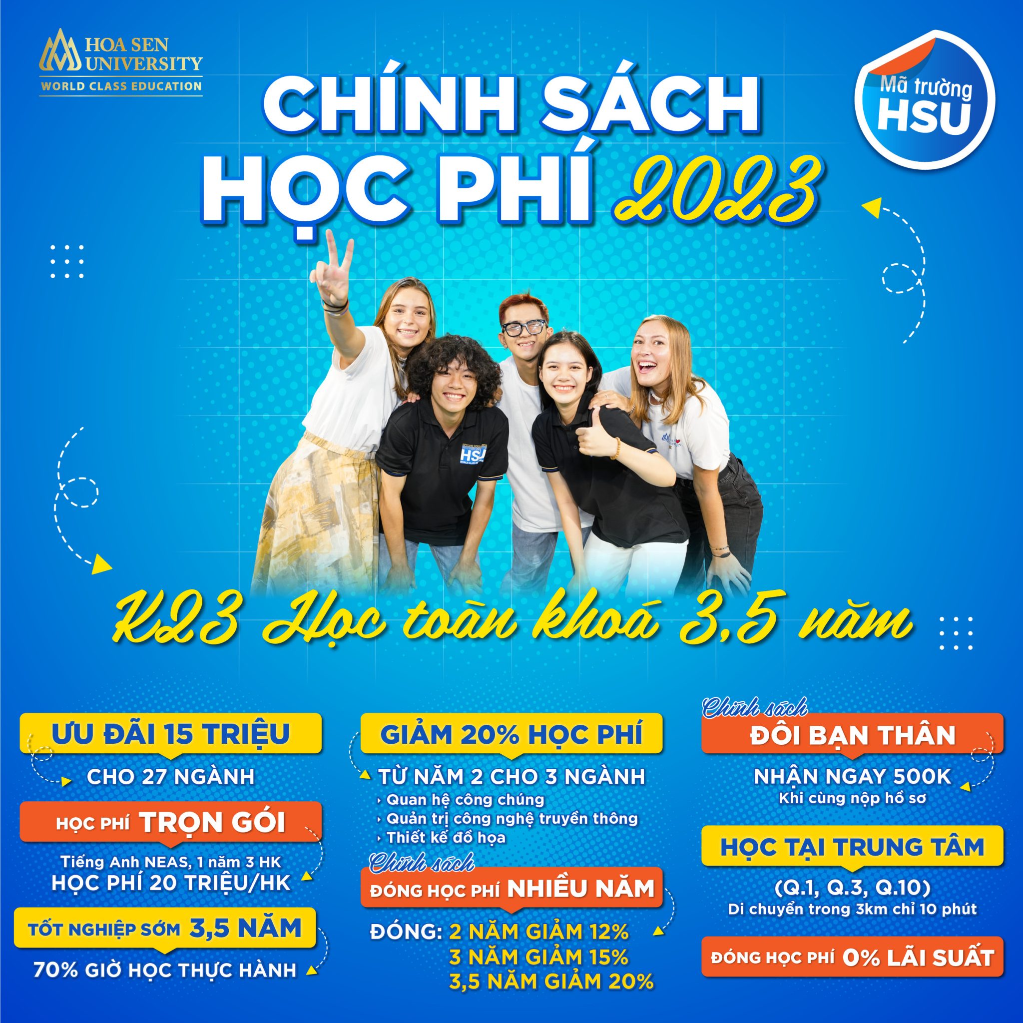 - Ưu đãi học phí 15 triệu cho 27 ngành học tại HSU khi thí sinh xét tuyển, trúng tuyển và nhập học vào trường Đại học Hoa Sen. Mức ưu đãi khấu trừ trực tiếp vào học phí cho lần đóng phí đầu tiên (kỳ 1 hoặc năm 1).