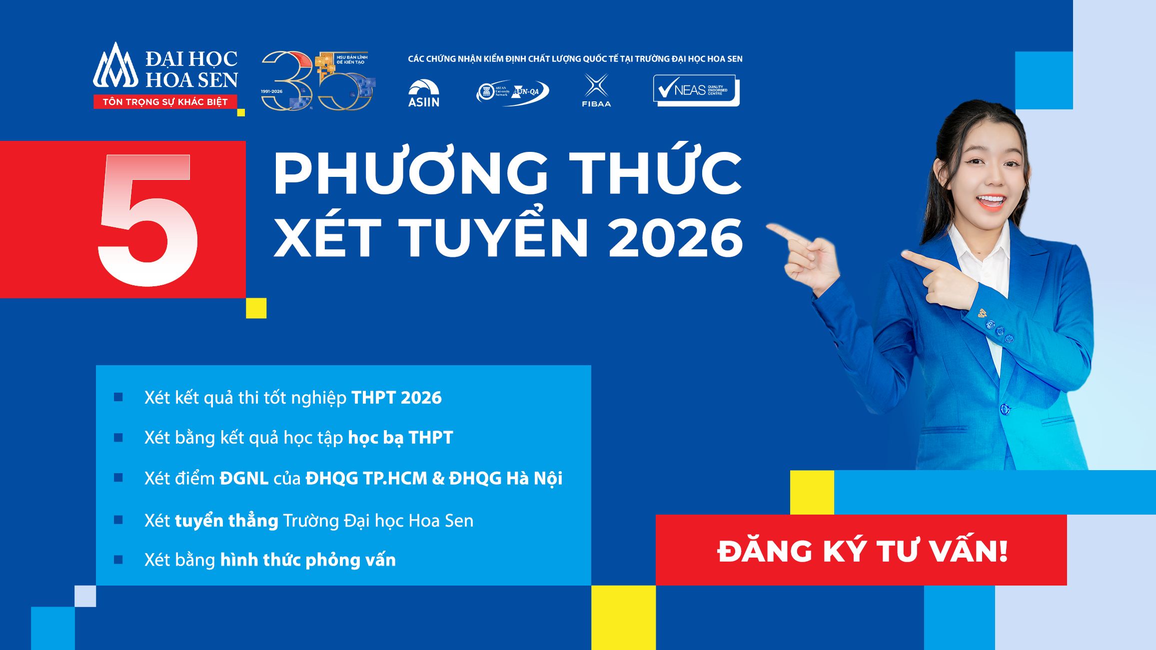Năm 2026, Trường Đại học Hoa Sen (HSU) dự kiến áp dụng 06 phương thức xét tuyển linh hoạt, giúp thí sinh chủ động lựa chọn phương án phù hợp với năng lực học tập và định hướng cá nhân, gia tăng lợi thế trúng tuyển đại học: