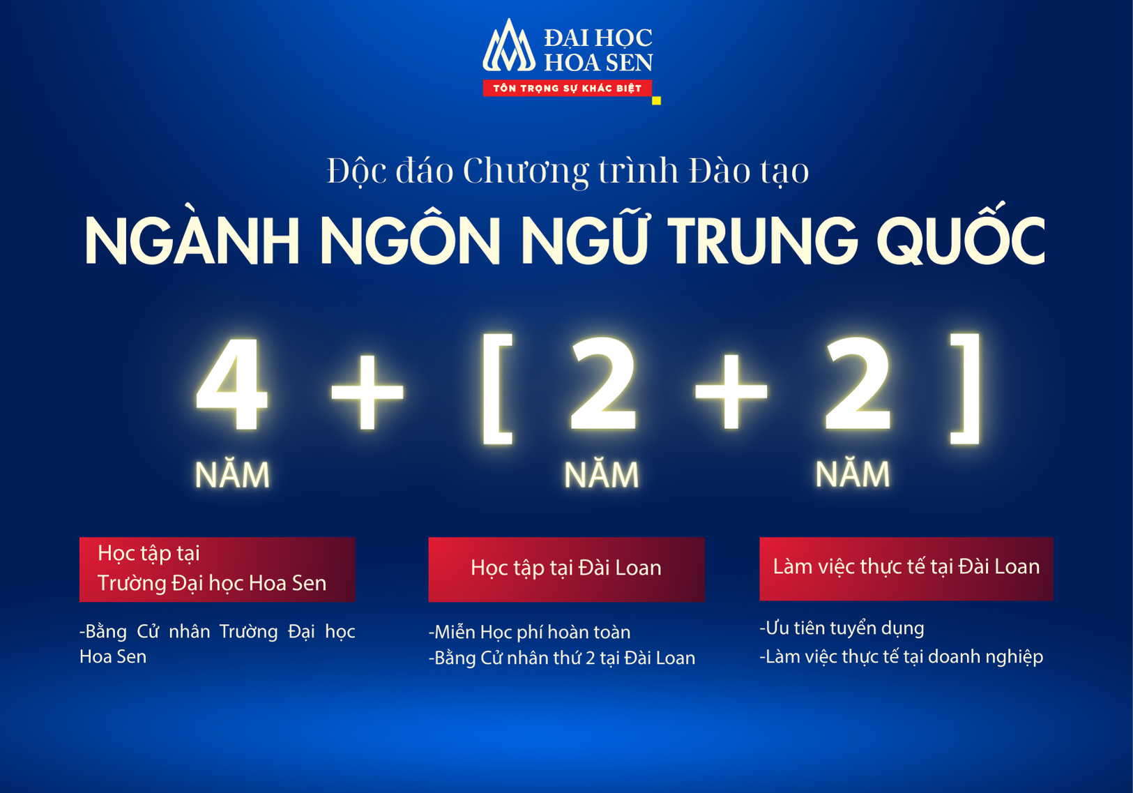 4 năm học tập tại trường Đại học Hoa Sen, 2 năm học bằng cử nhân ngành thứ 2 tại Đài Loan hoàn toàn miễn phí – 2 năm làm việc thực tế tại doanh nghiệp Đài Loan khi trở thành sinh viên ngành ngôn ngữ Trung Quốc trường Đại học Hoa Sen năm 2025.