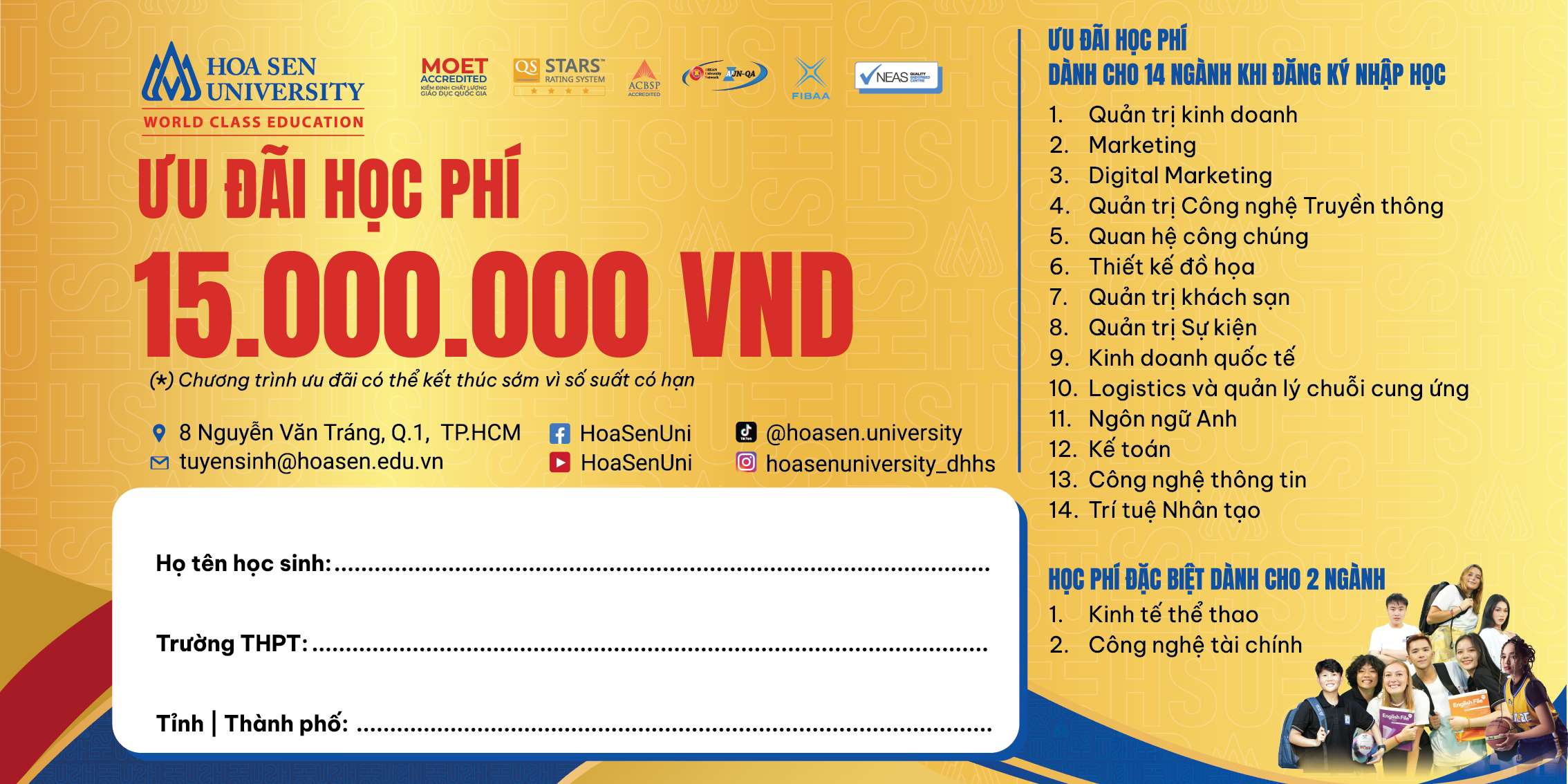 Năm học 2023, trường Đại học Hoa Sen (HSU) bắt đầu triển khai nhiều chính sách mới đem đến nhiều lợi ích cho người học khi lựa chọn học tập tại trường. Bên cạnh đó, tân sinh viên khóa 2023 sẽ được sở hữu Hoa Sen Boarding Pass, những ưu đãi học phí, những đặc quyền dành riêng khi chính thức trở thành sinh viên Hoa Sen