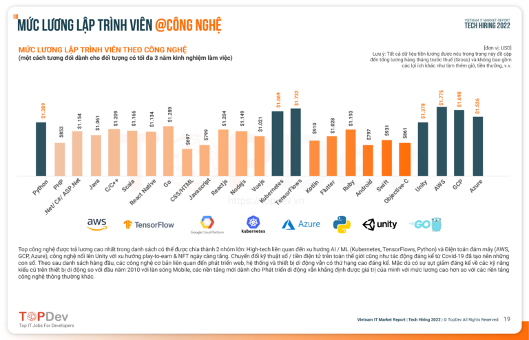 Theo Báo cáo Thị trường IT Việt Nam 2024 – 2025 của TopDev, mức lương cho các chuyên gia trong các lĩnh vực thuộc ngành Công nghệ thông tin liên tục tăng. Cụ thể, mức lương trung bình cho một lập trình viên tại Việt Nam vào năm 2024 ước tính dao động từ 1.100 đến 3.000 USD mỗi tháng, tùy thuộc vào kỹ năng và kinh nghiệm. Theo khảo sát, lập trình viên mới ra trường tại Việt Nam có mức lương trung bình từ 10 – 15 triệu VNĐ/tháng, trong khi nhân sự CNTT làm việc tại các công ty quốc tế có thể đạt 2.000 – 5.000 USD/tháng (~50 – 120 triệu VNĐ).