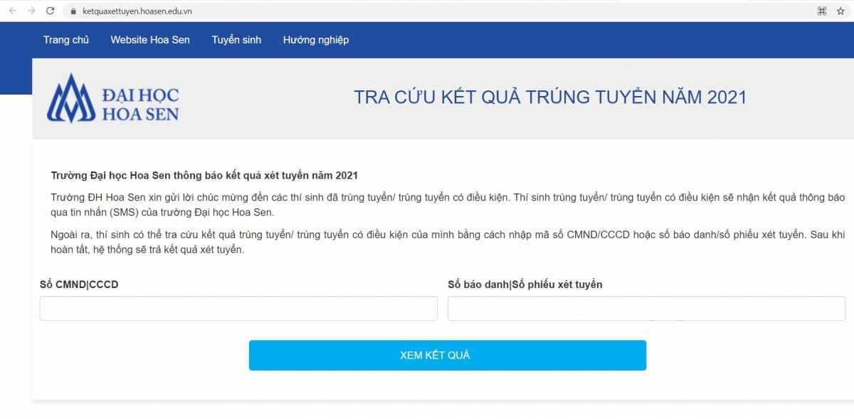 Thí sinh tra cứu kết quả tại: https://ketquaxettuyen.hoasen.edu.vn/