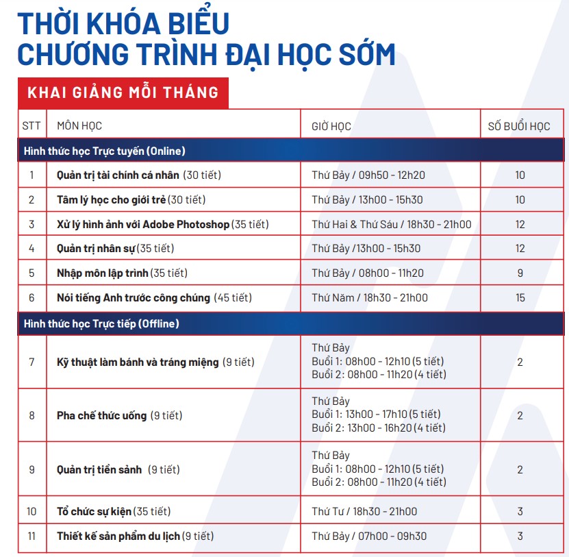 Mỗi học phần của Chương trình Đại học sớm được thiết kế linh hoạt (từ 30-45 tiết) tương đương 3 tín chỉ.