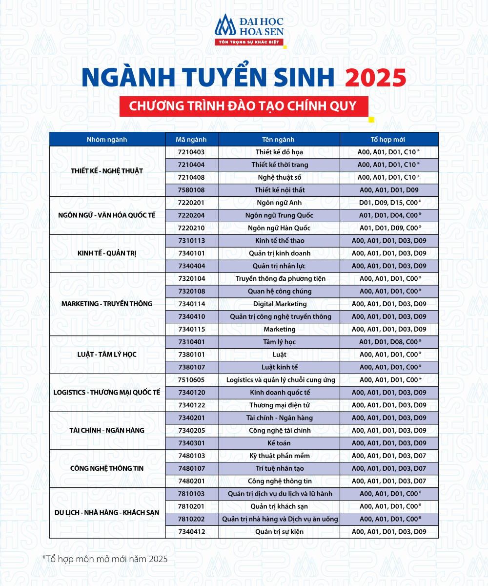 Năm 2025, Trường Đại học Hoa Sen tuyển sinh hệ đại học chính quy với hơn 31 ngành đào tạo chuẩn quốc tế thuộc 9 nhóm lĩnh vực: Kinh tế – Quản trị; Marketing – Truyền thông; Logistics – Thương mại Quốc tế; Công nghệ Thông tin; Du lịch – Nhà hàng – Khách sạn; Thiết kế – Nghệ thuật; Ngôn ngữ – Văn hoá Quốc tế; Luật – Tâm lý; Tài chính – Ngân hàng.