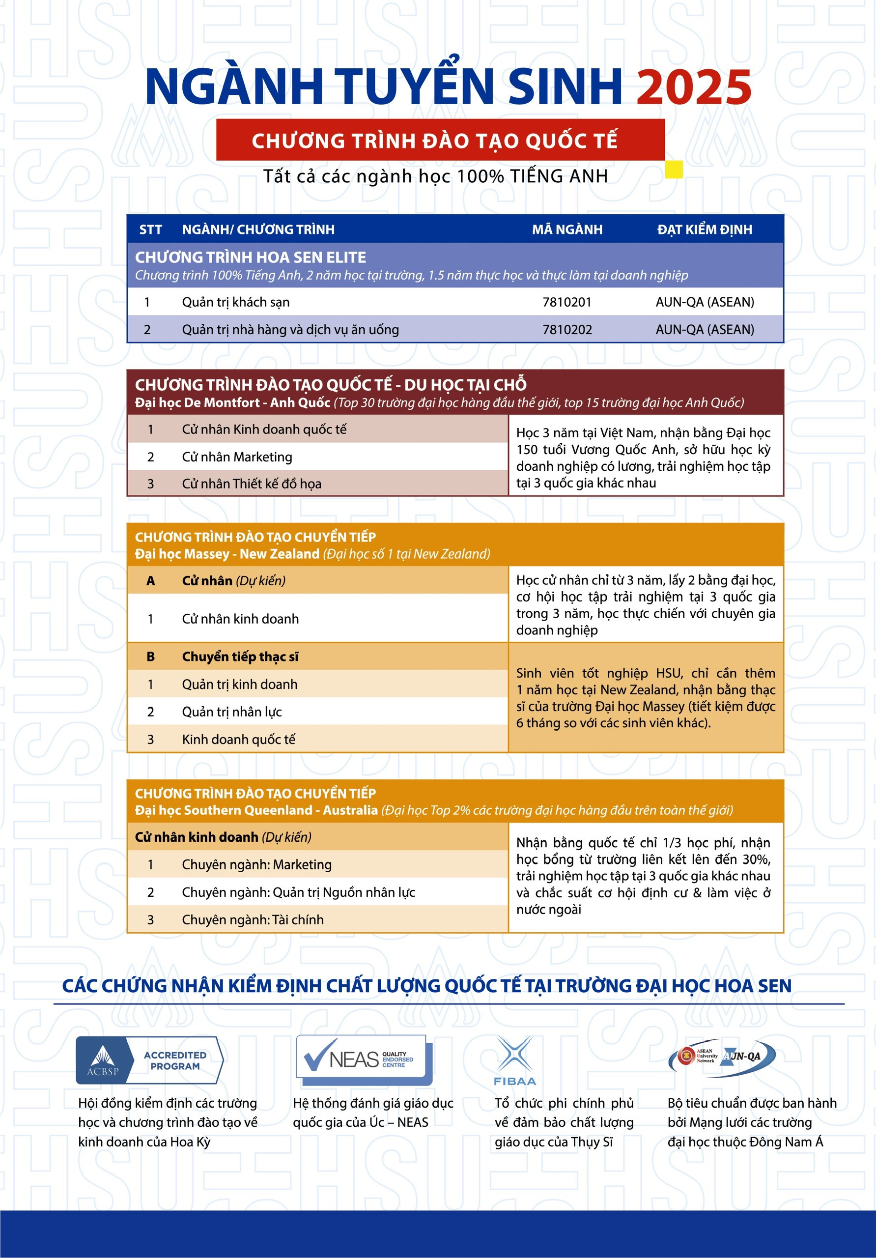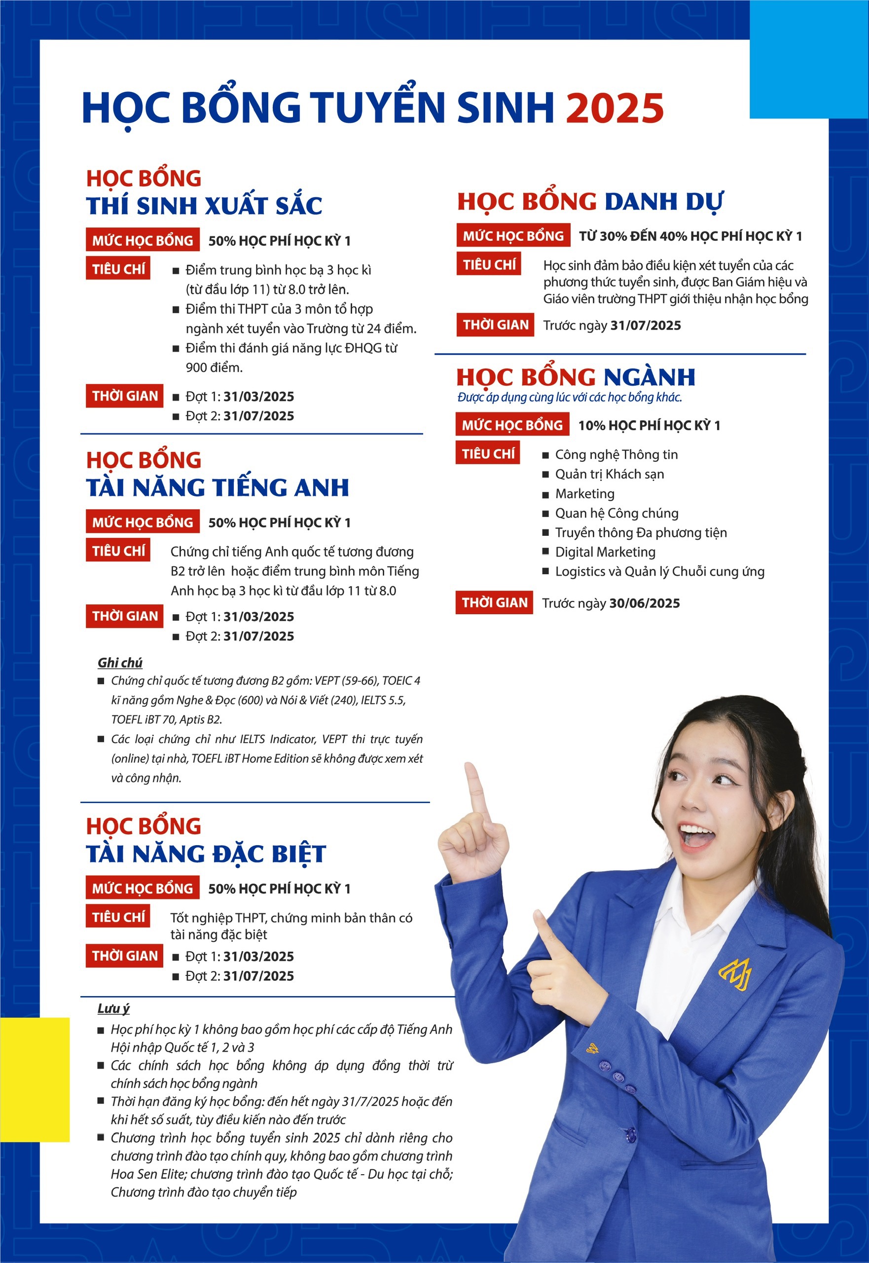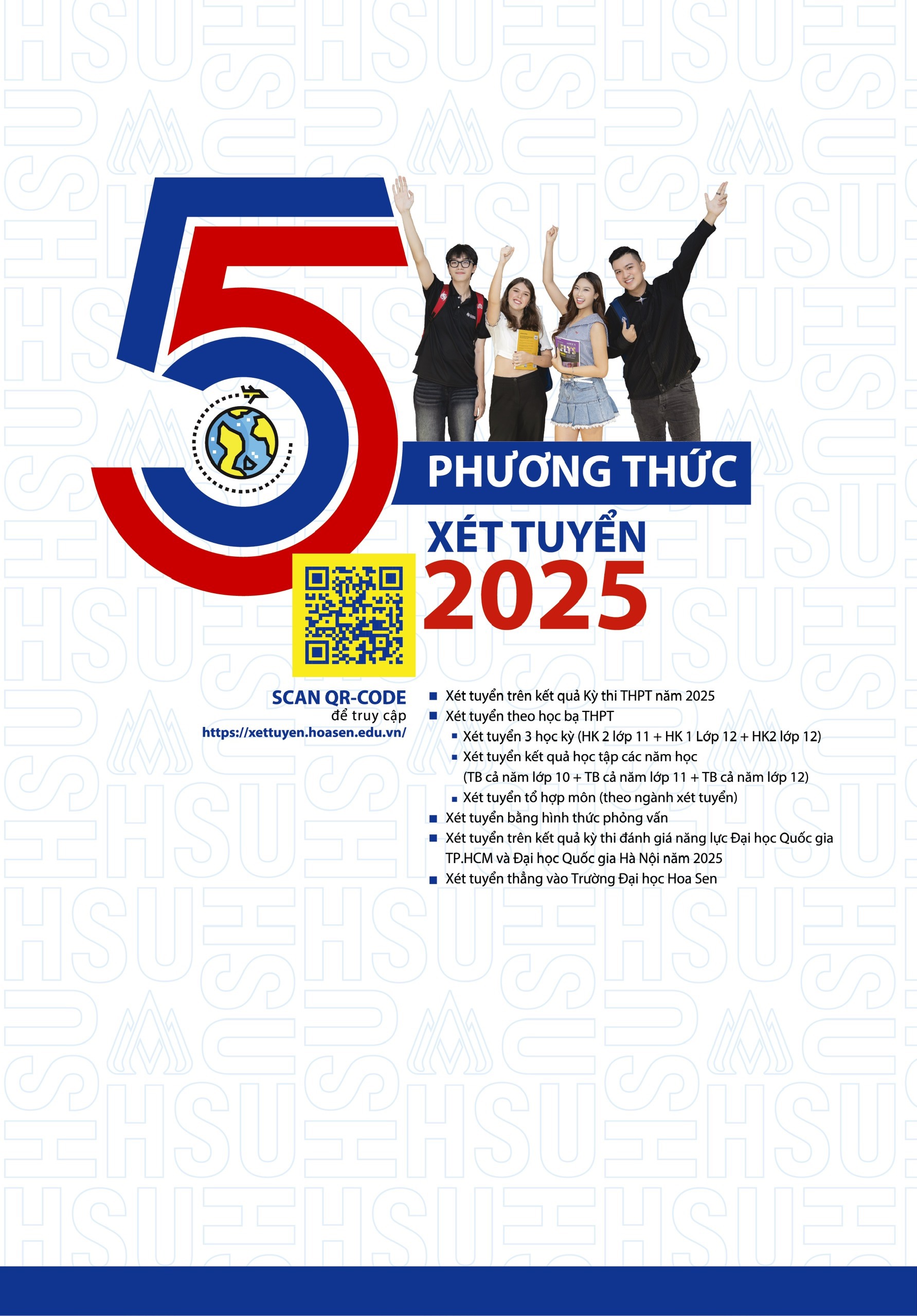 Trường Đại học Hoa Sen (HSU) trân trọng thông báo chương trình học bổng tuyển sinh năm 2025 dành cho các chương trình đào tạo chính quy. Chương trình học bổng này được thiết kế nhằm thu hút và phát triển nguồn nhân lực chất lượng cao, đồng thời tạo cơ hội học tập cho các tài năng trẻ.