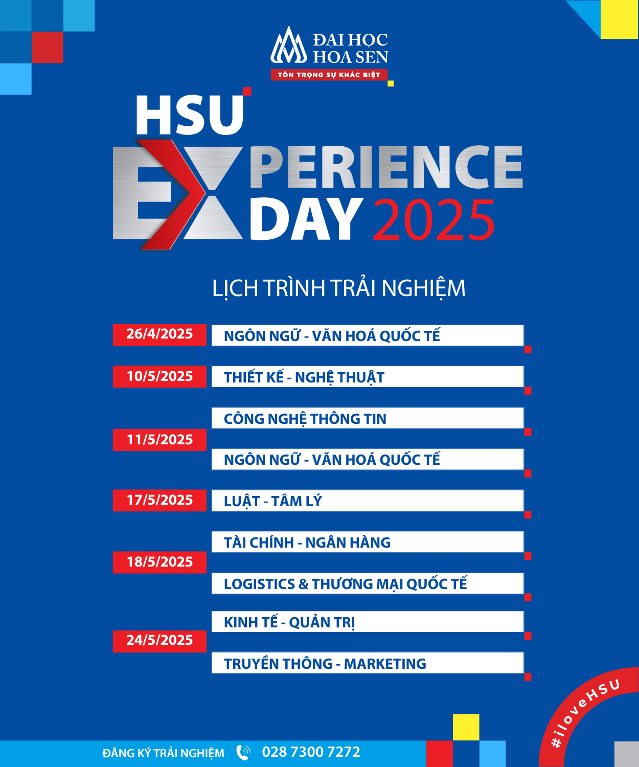 Bắt đầu từ ngày 26/04/2025, chuỗi sự kiện trải nghiệm của HSU Experience Day sẽ diễn ra vào các ngày Thứ 7, Chủ nhật hàng tuần.