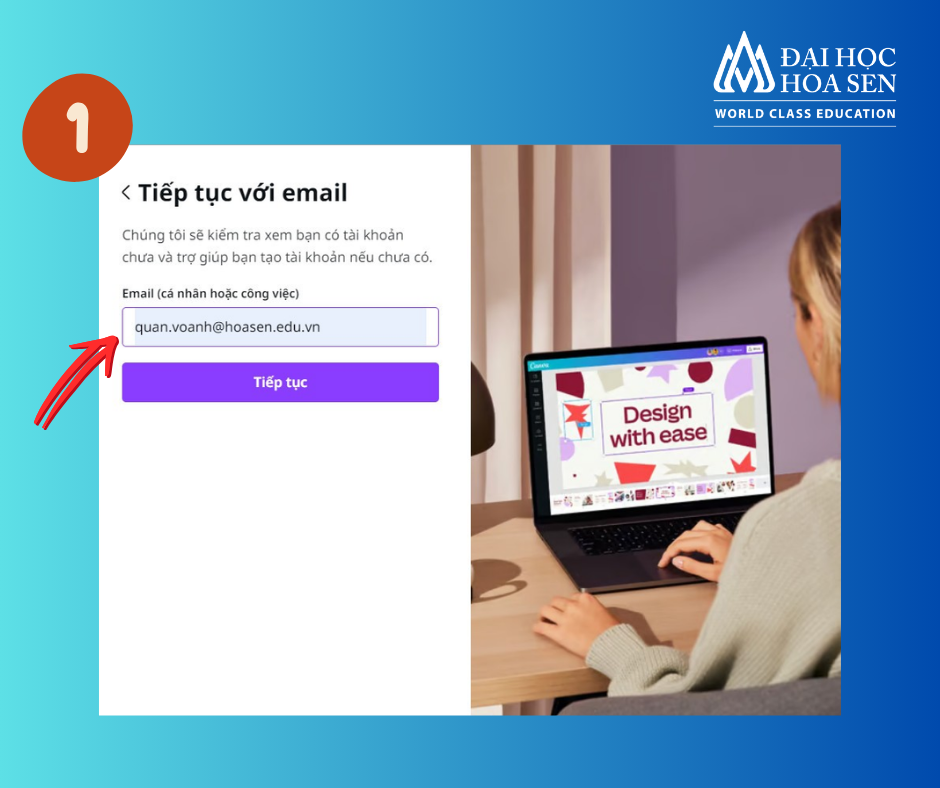 Bước 1: Bạn truy cập vào trang web: www.canva.com. Tiếp đến, nhấn đăng ký bằng Email sinh viên Hoa Sen.