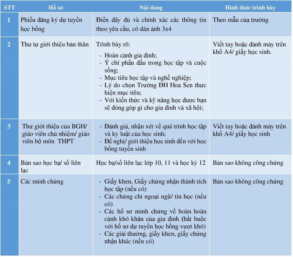 - Đối với nhóm học bổng tài năng và khuyến học: Hai thư giới thiệu của giáo viên chủ nhiệm, giáo viên bộ môn hoặc BGH trường THPT nắm rõ quá trình học tập, kỷ luật