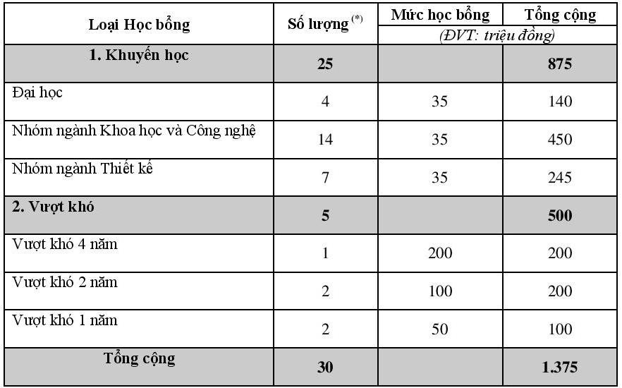 - Có điểm trung bình tích lũy trong năm học vừa hoàn tất từ B+ (3,3) trở lên với học bổng tài năng và B- (2,7) trở lên đối với học bổng vượt khó (theo thang điểm 4,0)