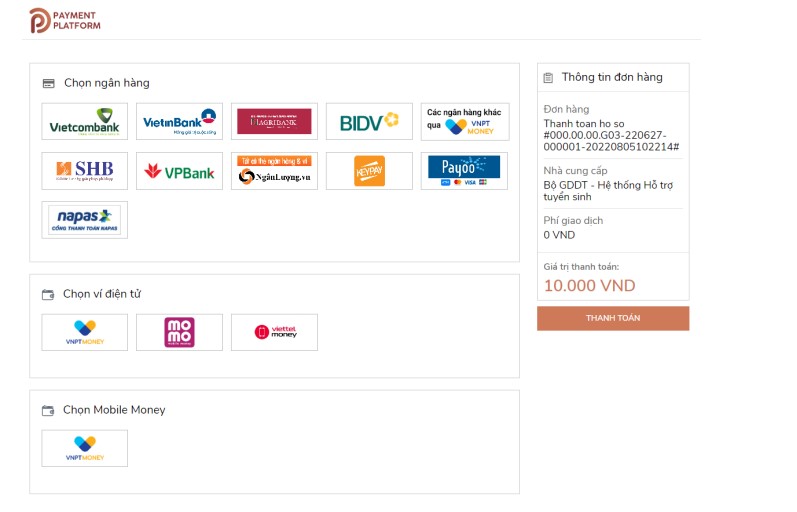 - Thí sinh có thể tự thanh toán bằng tài khoản ngân hàng/tài khoản ví điện tử của bản thân (nếu có) hoặc nhờ người thân, thầy/cô giáo thanh toán hộ trên giao diện thanh toán của thí sinh.