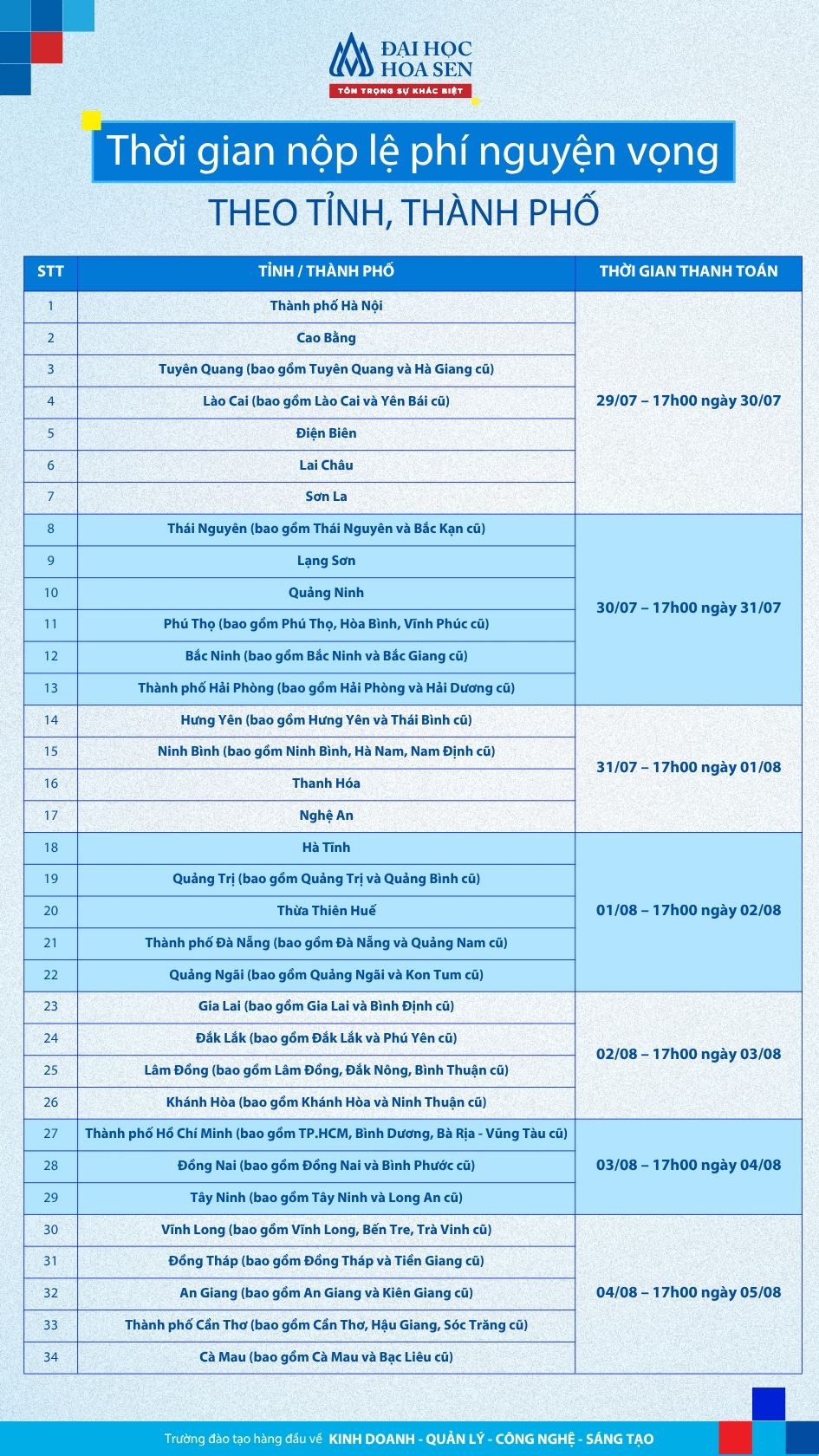 Từ ngày 29-7 đến 17h ngày 5-8, thí sinh cần hoàn tất việc nộp lệ phí xét tuyển trên Cổng thông tin tuyển sinh của Bộ Giáo dục & Đào tạo đúng thời hạn theo tỉnh, thành phố (Nơi thí sinh đã nộp hồ sơ). Nếu không nộp lệ phí đúng hạn, các nguyện vọng đã đăng ký sẽ không được hệ thống xét duyệt.