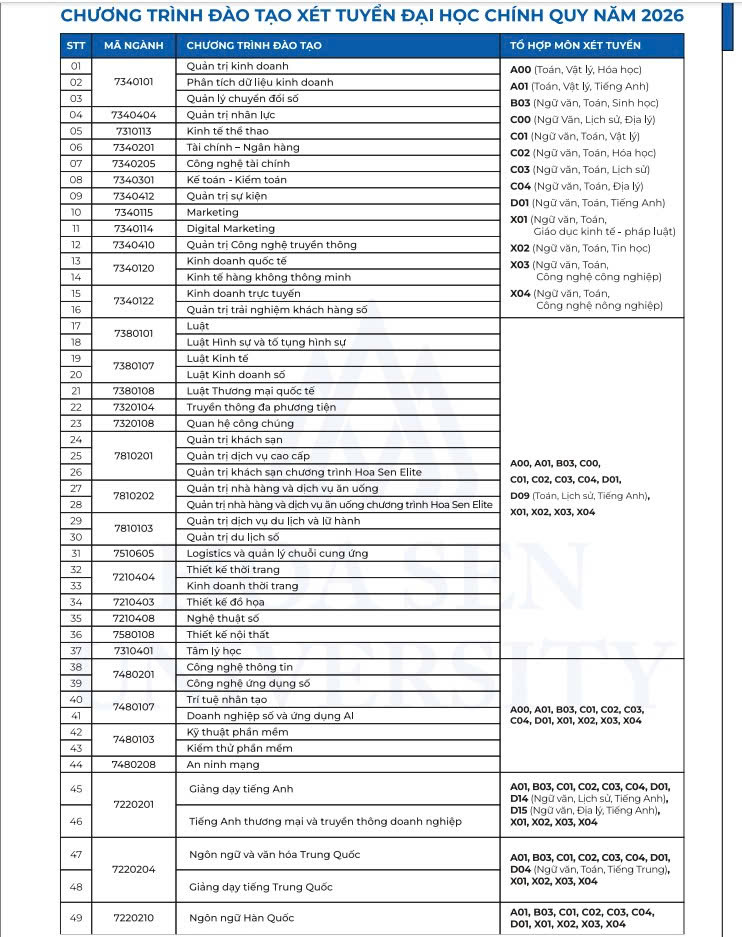 Năm 2026, Trường Đại học Hoa Sen áp dụng 5 phương thức tuyển sinh, bao gồm: