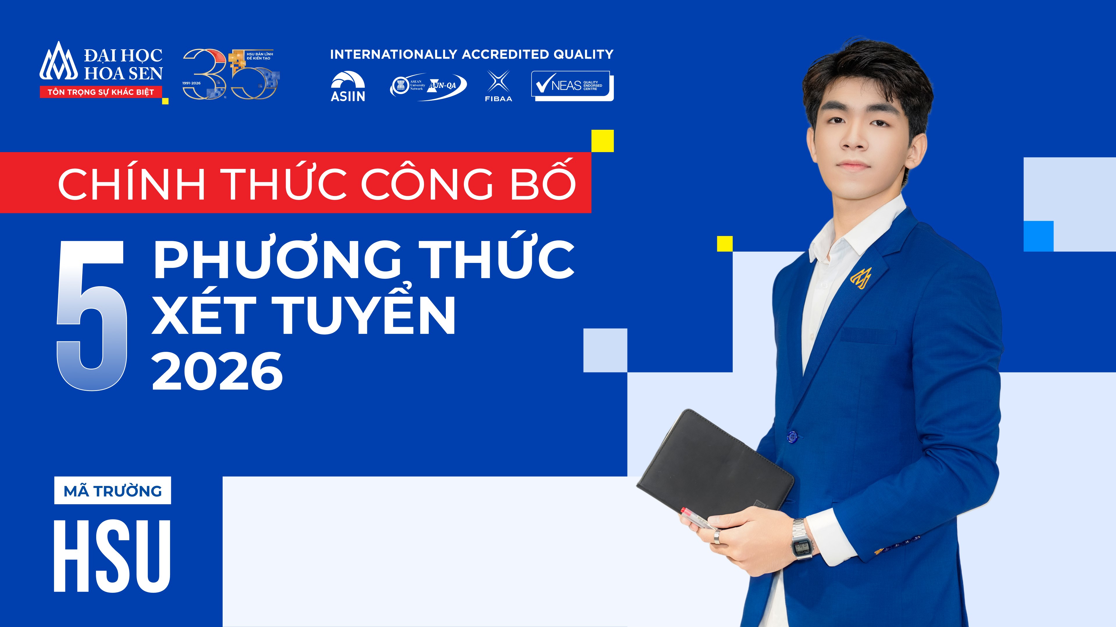 Trường Đại học Hoa Sen (HSU) chính thức áp dụng 05 phương thức xét tuyển năm 2026 đa dạng hình thức, giúp thí sinh chủ động lựa chọn phương án phù hợp với năng lực học tập và định hướng cá nhân, gia tăng lợi thế trúng tuyển đại học Các phương thức xét tuyển Đại học Hoa Sen 2026 Năm 2026, Trường Đại học Hoa Sen (HSU) công bố 05 phương thức xét tuyển áp dụng đối với 49 chương trình đào tạo chính quy trong đa dạng các lĩnh vực Kinh doanh, Quản lý, Luật, Công nghệ, Sáng...