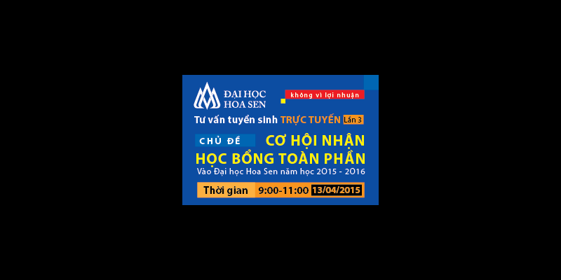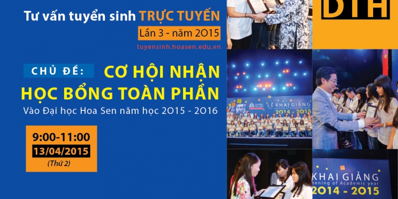 Buổi tư vấn trực tuyến, với chủ đề “Cơ hội nhận học bổng toàn phần vào ĐH Hoa Sen 2015 ” đang diễn ra tại Website Tuyển Sinh của trường Đại học Hoa Sen.Ngay từ bây giờ, các phụ huynh và thí sinh có thể tham gia đặt câu hỏi trực tiếp TẠI ĐÂY. Chương trình tư vấn sẽ bắt đầu từ 09:00 đến 11:00. Buổi tư vấn sẽ giải đáp những thắc mắc về chính sách học bổng Hoa Sen như thủ tục hồ sơ, điều kiện, tiêu chí xét tuyển học bổng.. từ đó giúp tăng cơ hội...