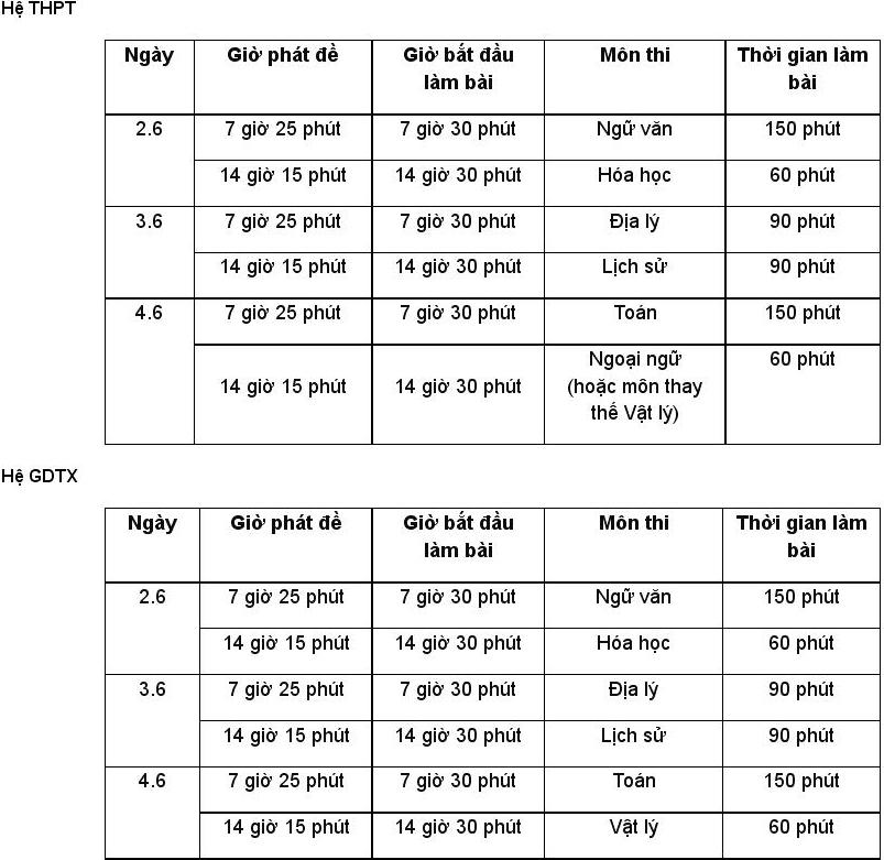 Kỳ thi năm nay sẽ diễn ra ngày 2, 3 và 4-6 với thứ tự các môn thi ngữ văn (150 phút), hóa học (60 phút), địa lý (90 phút), lịch sử (90 phút), toán (150 phút), ngoại ngữ (60 phút), vật lý – đối với thí sinh thi môn thay thế và thí sinh hệ giáo dục thường xuyên (60 phút).